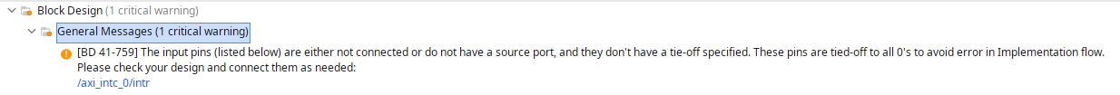 到此为止, 基础平台的硬件部分就完成了, 生成 Block Design 的时候唯一应该产生的 Critical Warning 是提示有 AXI 中断控制器的输入端口没有任何链接, 这是合理的, 因为这个端口本身就是用来给后续 Vitis 加速核使用的, 现在是不会连接上的. 除此之外的 Warning 都需要检查一下.