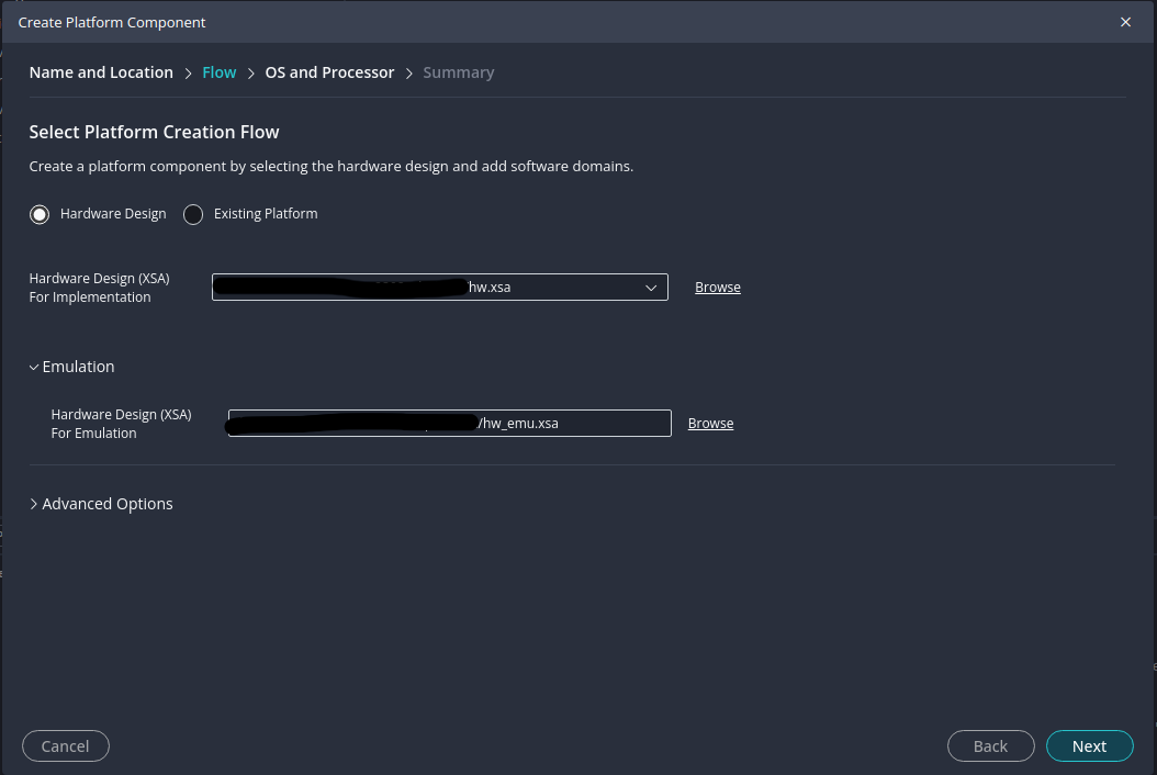 打开 Vitis, 创建一个新的 Platform Project, 选择刚刚导出的 .xsa 文件作为硬件描述文件导入即可, 如果单独创建了硬件平台模拟用的 .xsa 文件可以单独设置, 否则就用同一个文件即可.