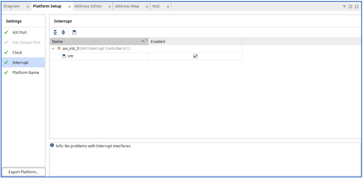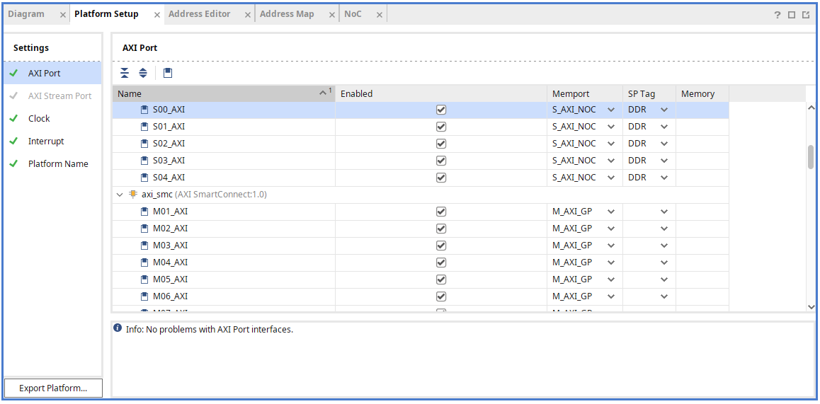连线完成后需要配置一些平台设置, 也就是 "Platform Setup" 部分. 在这里面勾选的端口会被暴露给 Vitis 使用, 否则 Vitis 无法访问这些硬件端口. 首先配置 AXI Port, Vivado 会强制你至少勾选一个 Master AXI 端口和一个 Slave AXI 端口. 我们把 DDRMC 所在的 NoC IP 上的所有 Slave AXI 端口都勾选上, Tag 设成 DDR , 这样 Vitis 就能利用这些端口访问 DDR 内存了. 另外配置中断控制器的时候应该生成了一个 AXI SmartConnect IP, 把它的 M_AXI 端口多勾几个(十几个都行, 反正不嫌多), Memport 就用默认的 M_AXI_GP 就行.