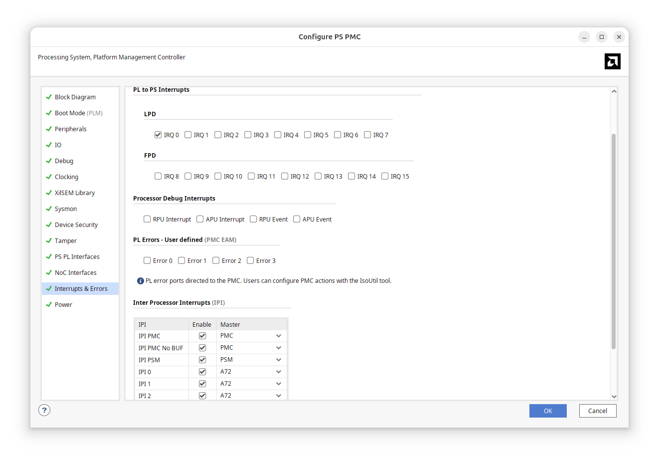 最后是中断配置, 我们将刚刚创建的 AXI 中断控制器暴露给 Vitis 使用, Vitis 中后续用到的所有 PL 端中断都会通过这个中断控制器来管理.