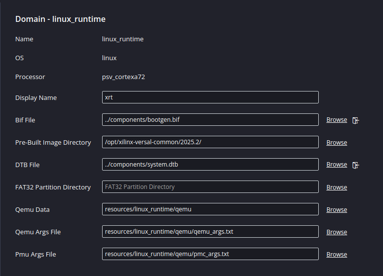 };保存后重新编译 Petalinux 项目并烧录到板子上即可解决问题. 如果你在用 Xilinx 预构建的 Versal Common Image, 可以在你的平台设置中单独指定设备树文件, 系统镜像仍然用这个预构建镜像的, 只是覆盖掉设备树部分.