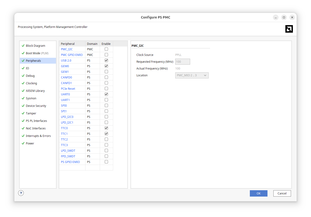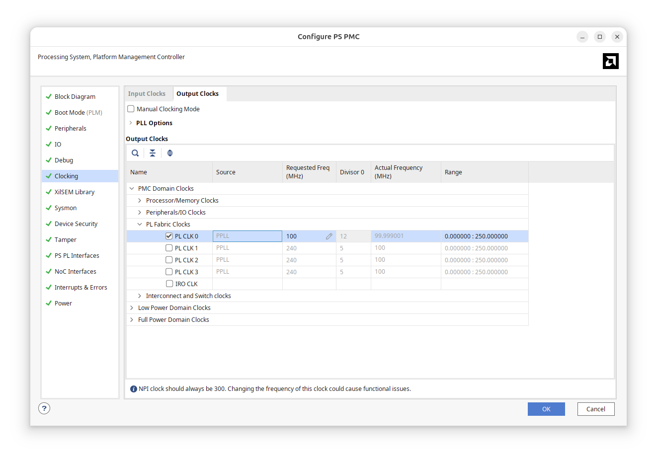 一个需要注意的点是型号的速度等级, 有些型号的 M_AXI_FPD 总线就跑不了那么高的频率, 比如 ALINX VD100 这块的速度等级最高好像只能跑到 250MHz 时钟 (至少 300MHz 下实现跑不过), 所以需要对应地降低一点频率, 至于多少是上限找手册或者看时序报告.