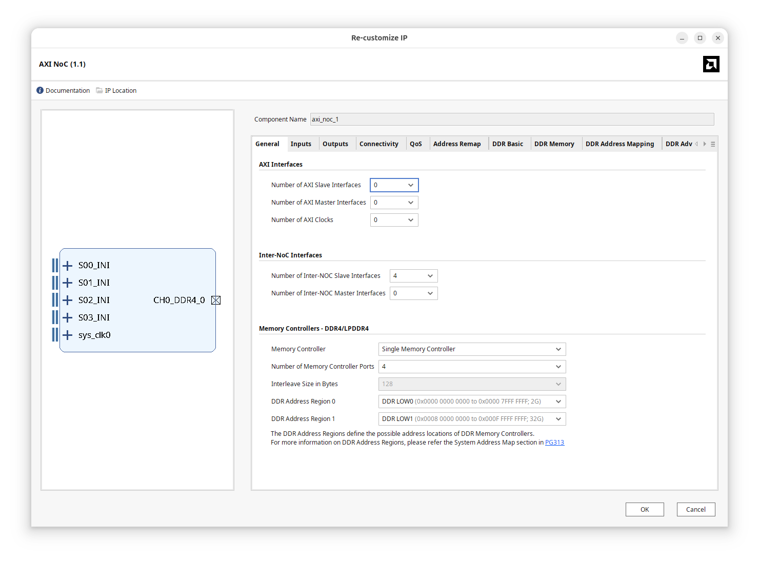 和 ZynqMP 不同的是, Versal 里面新加入了 NoC 作为 PS/PL/AIE 之间的互联总线. 它单独作为一个 IP 核存在, 并且集成了 DDRMC 的功能. NoC IP 对外可以通过 AXI 总线访问, 或者通过 DDRMC 访问内存, 而 NoC IP 之间通过内部的端口进行连接. 在上面的 Block Design 里面可以看到添加了两个 NoC IP, 其中一个作为总线互联, 另一个单纯作为 DDR 控制器使用, 尽管看起来这是两块 IP, 但实际上和连在一起, 也就是同一个 IP 里面既启用互联又启用 DDRMC 功能是一模一样的效果.