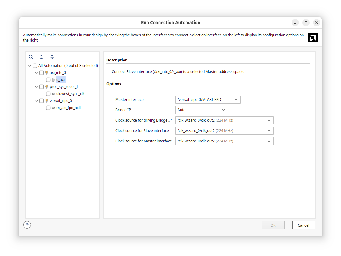 ACTIVE LOW, 因为 PS 端引出的 PL 复位信号是低电平有效的.ext_reset_in 全部连到 PS 端引出的 PL 复位信号上.s_axi 控制端口连到 PS 端的哪个 Master AXI 总线上 (也就是在 CIPS 上开启过的那个 M_AXI_FPD 总线). 另外这条总线需要一个驱动时钟 m_axi_fpd_aclk, 这个时钟也接在默认时钟域上.Block Automation 界面如下图所示. Slave Clock 是 IP 本身的时钟输入, Master Clock 是它要连接的 AXI 总线的时钟输入, Bridge IP 是用来将 s_axi 端口连接到 PS 端的 M_AXI_FPD 总线的桥接 IP, 这个桥接 IP 会自动生成并添加到设计里面去的, 但需要指定时钟. 这三者连到同一个时钟域就是最简单的做法.