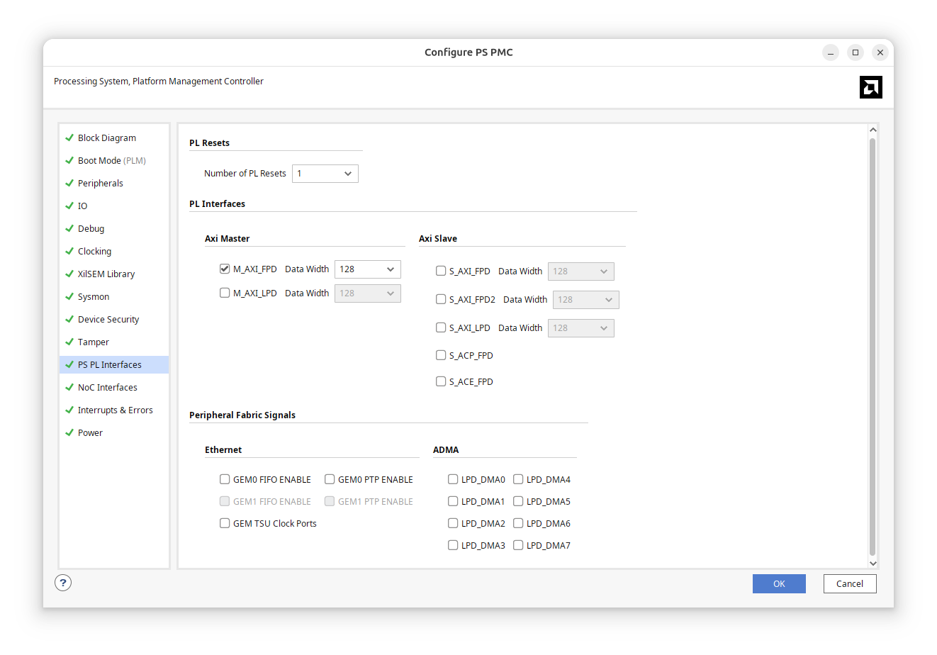 PL PS 接口选择上, 至少开一个 PL 复位信号端口和一条 M_AXI_FPD 总线用来做复位逻辑和 PL 端控制信号传递.