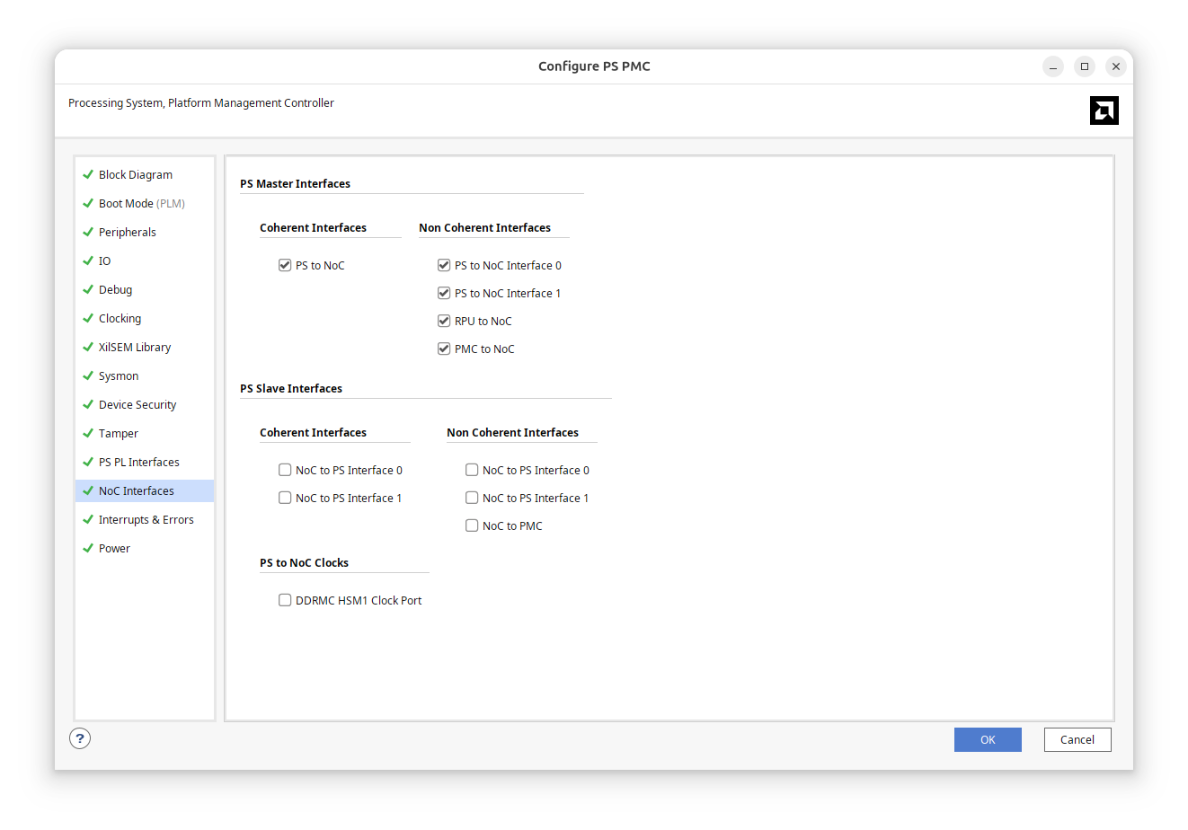 NoC PS 接口选择上, PS Master 端口全开, Slave 端口可选.