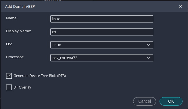 三种操作系统添加完成后重点关注 linux 运行时的设置. Bif File 直接点击右侧的按钮让 Vitis 自动生成一个, Pre-Built Image Directory 选择之前下载并且解压好的 Versal Common Image 的路径. 最后一个是设备树. 设备树没有办法直接用 Vitis 生成, 需要用 Petalinux Tools 来生成. 具体生成方法见下文 "生成设备树和启动引导文件" 一节. 生成好设备树后将 system.dtb 文件复制到某个路径下, 然后在这里指定这个路径即可.